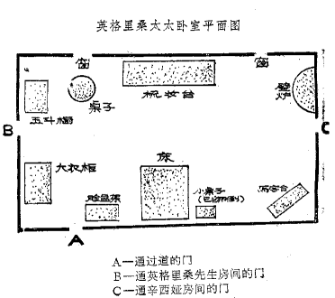 我们匆匆赶到庄子里,拐进庄园园林的大门。波洛停下站了一会,无限感慨地凝视着这一大片园林的美丽景色,朝露还在放射出灿烂的珠光。 “多美啊,有多美!然而,这家可怜的人家却陷入了痛苦,沉浸于悲伤。” 他说话时,目光锐利地朝我注视着,我感到,在他的长时间的注视下,我的脸红了。 这家人家被悲伤征服了么?英格里桑太太的死引起的痛苦是如此强烈么?我感到空气中缺乏这种感情。去世的女人没有博得家大的爱戴。她的死是打击和不幸,但是她将不会受到深深的哀悼。 波洛仿佛尾随着我的思想。他严肃地点点头。 “是呀,你说得对,”他说,“他们不象有血缘关系。她虽然对待卡文迪什家的人仁慈,慷慨,可是她毕竟不是他们的亲生母亲,血缘——你千万要记住这点——血缘。” “波洛,”我说,“我希望你能告诉我,为什么你要了解英格里桑大太昨天晚上吃得是不是好呢?这问题一直在我脑子里祈腾,可我闹不清楚这和事情有什么关系。 他沉默了一两分钟。我们一直走着,后来,他终于开腔了: “我不反对告诉你——虽然,你也知道,事情没有到达结局就作解释,这不是我的习惯。现在的问题是,英格里桑太大有可能是被下在她的咖啡里的士的宁毒死的。 “真的?“ “是呀,咖啡是什么时候送的?” “八点左右。” “这么说,她是在八点至八点半之间这段时间喝的了——一定不会太晚。嗯,士的宁是一种功效相当快的毒药。它的毒性很快就能感觉到,可能在一小时之内。然而,在英格里桑太太身上,中毒的症伏直到第二天早上五点钟才出现。整整九个小时!固然,要是吃得很饱,几乎在同时服下药,可以拖迟毒性发作的时间,可是不太可能拖得那么久。不过这种可能性还是得加以考虑。但是,据你所说,她晚饭吃得很少,而中毒的症状竟到第二天一早才出现!这是一个难以理解的情况,我的朋友。通过尸体解剖可能会得到某种解释。到时候,你记着这一点。” 当我们走近房子时,约翰出来迎接我们。他的脸色显得疲倦,憔悴。 “这是一件极不愉快的事情,波洛先生。”他说,“哈斯丁已经对你说明了吧?我们迫切希望不要把这事宣扬开。” “我完全理解。” “你知道,到目前为止这仅仅是怀疑。我们还没什么根据。” “确实如此。这只是一种预防措施。” 约翰转脸朝向我,同时掏出烟盒,点燃了一支烟。 “你知道吗,英格里桑那家伙回来了?” “知道。我碰到他了。” “约翰把火柴梗扔到了近旁的花床上,这种行为实在使波洛感情上受不了。于是他把它拾了起来,顺手埋掉了。 “难哪,不知道怎么来对待他。” “这种难处不会太久了。”波洛平静他说。 约翰显出迷惑不解的样子,不十分理解波洛说的隐晦的预言,他把鲍斯坦医生给他的两只钥匙交给了我。 “凡是波洛先生要看的,全部给他看着。” “房间锁着的?”波洛问道。 “鲍斯坦医生认为这样为好。” 波洛若有所思地点点头。 “那他是很有把握了。哦,对我们来说这使事情简单多了。” 我们一起走向发生悲剧的那个房间。为了方便起见,我附上下面这一张房间和房间中主要家俱陈设的平面图。 ![]() 波洛在里面锁上了门,对房间进行了仔细的检查。他象蚱蜢一样灵活地从一件物品蹦向另一件物品。我怕抹掉什么线索,一动不动地站在门边。然而,波洛对于我的克制态度,似乎并无感激之意。 “你怎么啦,朋友?”他大声嚷道,“你站在那儿象个——那叫什么来着?——啊,对了,干么象根木桩子呀?” 我解释说,我怕抹掉什么足迹之类的东西。 “足迹?亏你想得出!这房间实际上就象来过一支军队了!我们还能找出什么足迹来呀?别站在那儿了,来,帮我一起来搜查吧。在我要用它之前,得先放下我的小公文箱。 说着,他把小箱子往窗边的圆桌上一放,可是动作猛了一点,结果由于桌面是松动的,它一边向上翘了起来,猛地使公文箱摔落到地板上。 “瞧这桌子!”波洛叫了起来。“嗨,我的朋友,一个人有可能住一幢大房子,可是也可能并不舒适。” 在作了一番说教之后,他重又开始检查。 写字台上有一只紫红色的小公文箱,箱于的锁上插着一把钥匙,这一时引起了他的注意。他从锁孔中拨出钥匙,递给我作检查。可是我看着并无特别之处。这是一把普通弹簧锁的钥匙,捏手的地方扎着一段拧在一起的金属线。 接着,他又检查了已被我们推破的门框,弄清楚插销确实被毁坏了。然后他又走到对面的通向辛西娅房间的门边。正如我所说的那样,这扇门也是闩住的。可是,他却拉开了插销,把门打开又关上,试了好几次;试的时候,他十分小心,尽量避免发出任何声音。突然,插销上的什么东西似乎引起了他的注意。他仔细作了检查。于是,敏捷地从自己的箱子里取出一只镊子,夹起一点极小的东西,小心翼翼地把它放进一只小小的封袋。 五斗橱上搁着一只托盘,盘子里有一盏酒精灯,上面放着一只小小的长柄平底锅。锅子里还留有少量发黑的液体。一只已经喝尽的空怀子和茶托摆在它的旁边。 我自己也感到奇怪,我怎么会这样粗心,连这都给看漏了。这儿有这么一个有价值的线索。波洛灵巧地伸出一个指头往液体里蘸了一下,然后小心翼翼地尝了尝。他装出一副怪相。 “可可——里面还掺了——我想是——糖酒。” 床边的一张小桌已经翻倒在地,他走到掉落在地板上的那摊东西跟前。一盏台灯,几本书,一些火柴,一串钥匙,一只打